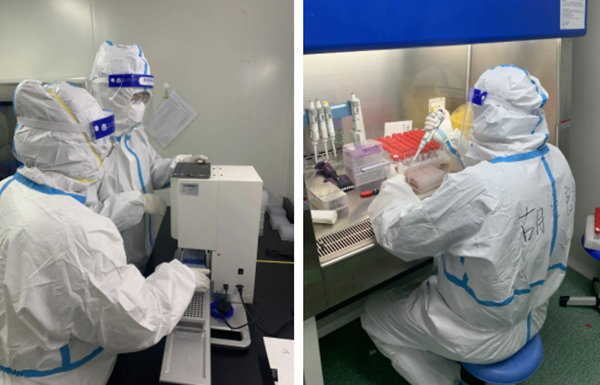 3月19日清晨,团队及物资到达怀化后,又迅速投入到气柱式帐篷实验室安装工作中,并于当日全部建成投入使用。该实验室日最高检测样本量达到3万管以上,按照10混1的检测方式,每日最高检测样本量达30万人份。